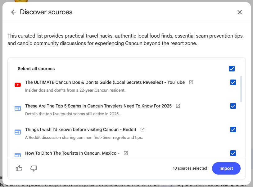 I was short on time and needed something I could absorb on the go. My only real free time was during evening walks, so I decided to turn that into learning time. Using NotebookLM, I asked it to create a short podcast I could listen to on my phone. One on the top 10 things to do in Cancun, another on common scams to watch out for, and a third on how to make the most of your resort stay.