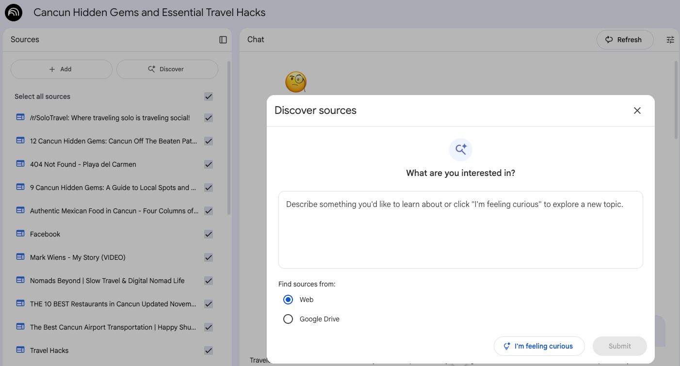 If you’d rather tap directly into Google’s search power without using another tool, NotebookLM can handle that too. Just click “Discover” and run the same prompt. It’ll pull fresh source links straight from Google Search. You can also use it to scan your Google Drive and surface any relevant documents or notes from your own files.