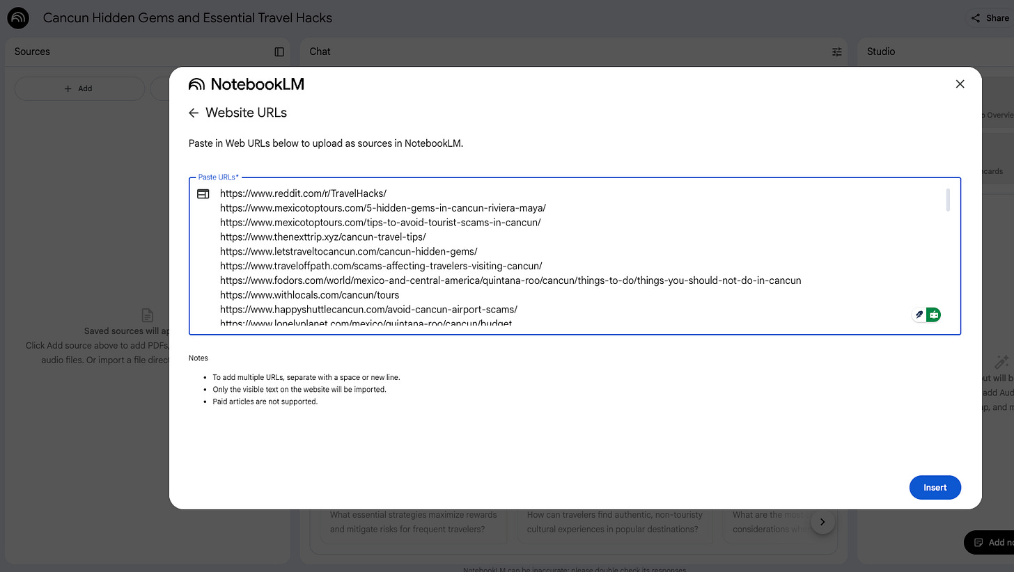 Once you have the clean set of URLs in NotebookLM, you can start running your research.