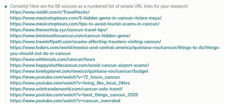 You see that Perplexity used 56 sources for its research. We’re interested in this list. Use the below prompt to get those.